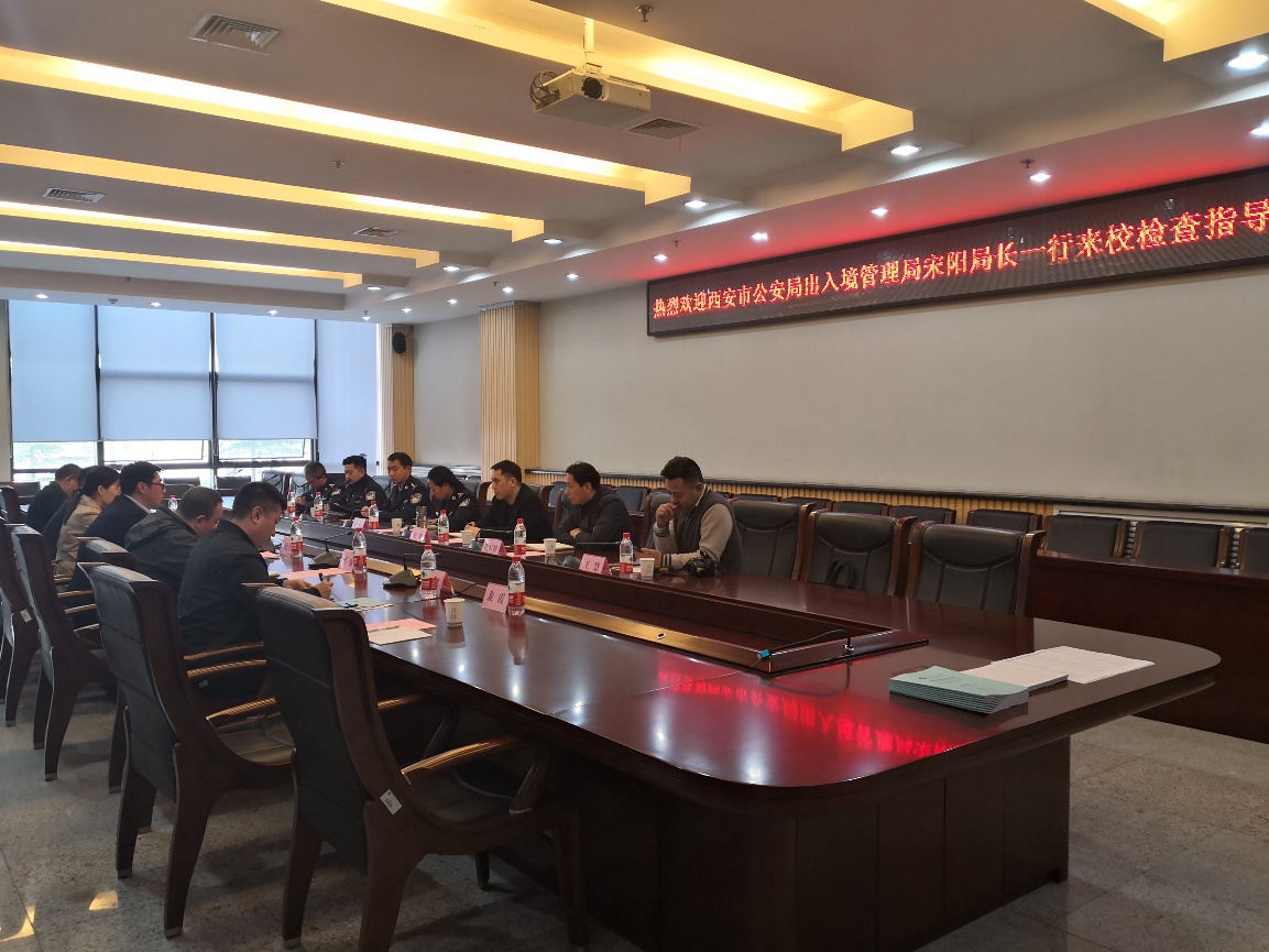 11月11日下午,西安市公安局出入境管理局局长宋阳等来公司鄠邑校区就职工签证及职工日常管理等工作进行调研和督查,调研座谈会在鄠邑校区图书馆第二会议室举行。市公安局出入境管理局外管一科、鄠邑分局外事警官,公司鄠邑校区管理办公室、保卫处、威廉williamhill体育等部门有关人员参加调研和座谈。