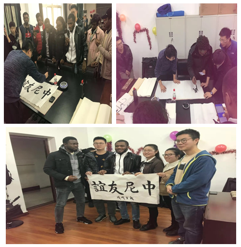 交流会上,研究生院外语类2018级员工代表刘亚丽为尼日利亚职工介绍了中国春节、中秋节、端午节和清明节等传统节日的文化渊源,带领同学们了解我国丰富的传统文化及风俗习惯;研究生社团——翰墨书社成员王德明挥毫展示了中国传统书法,让大家体会中华文化厚重醇香的韵味。很多尼日利亚职工当即对书法产生了浓厚的兴趣,现场亲自提笔感受毛笔与宣纸摩擦的那份黑白触感,并合作书写了“中尼友谊”四个字来代表双方的亲密友谊。