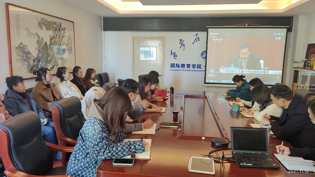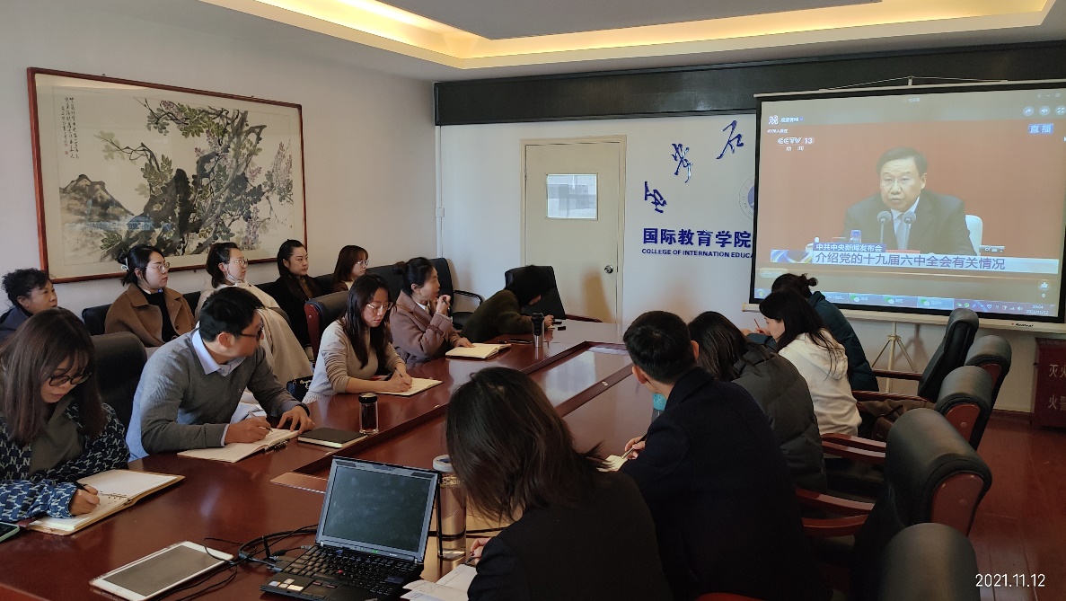 11月12日上午,在第二教学楼801会议室,威廉williamhill体育组织全院教工在线收看党的十九届六中全会新闻发布会直播。全公司党群21人参加学习。
