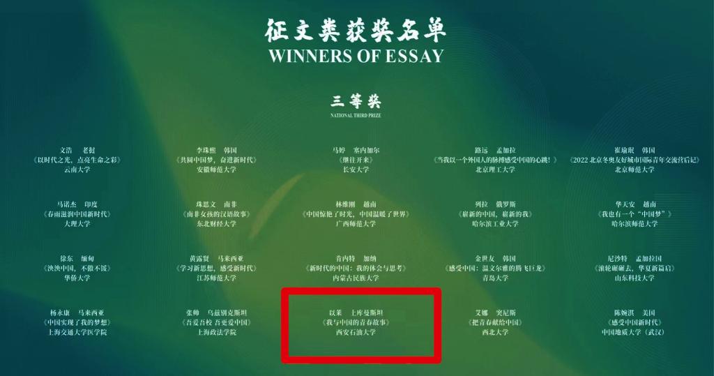 2022年11月,由中共中央对外联络部《当代世界》杂志社与中国新华新闻电视网等联合主办,国家留学基金管理委员会秘书处协办的“感受中国新时代”主题征文、摄影和短视频大奖赛获奖结果公布,并在北京举办了线上线下颁奖仪式。公司土库曼斯坦籍职工以莱的作品《我与中国的青春故事》荣获征文类全国三等奖。