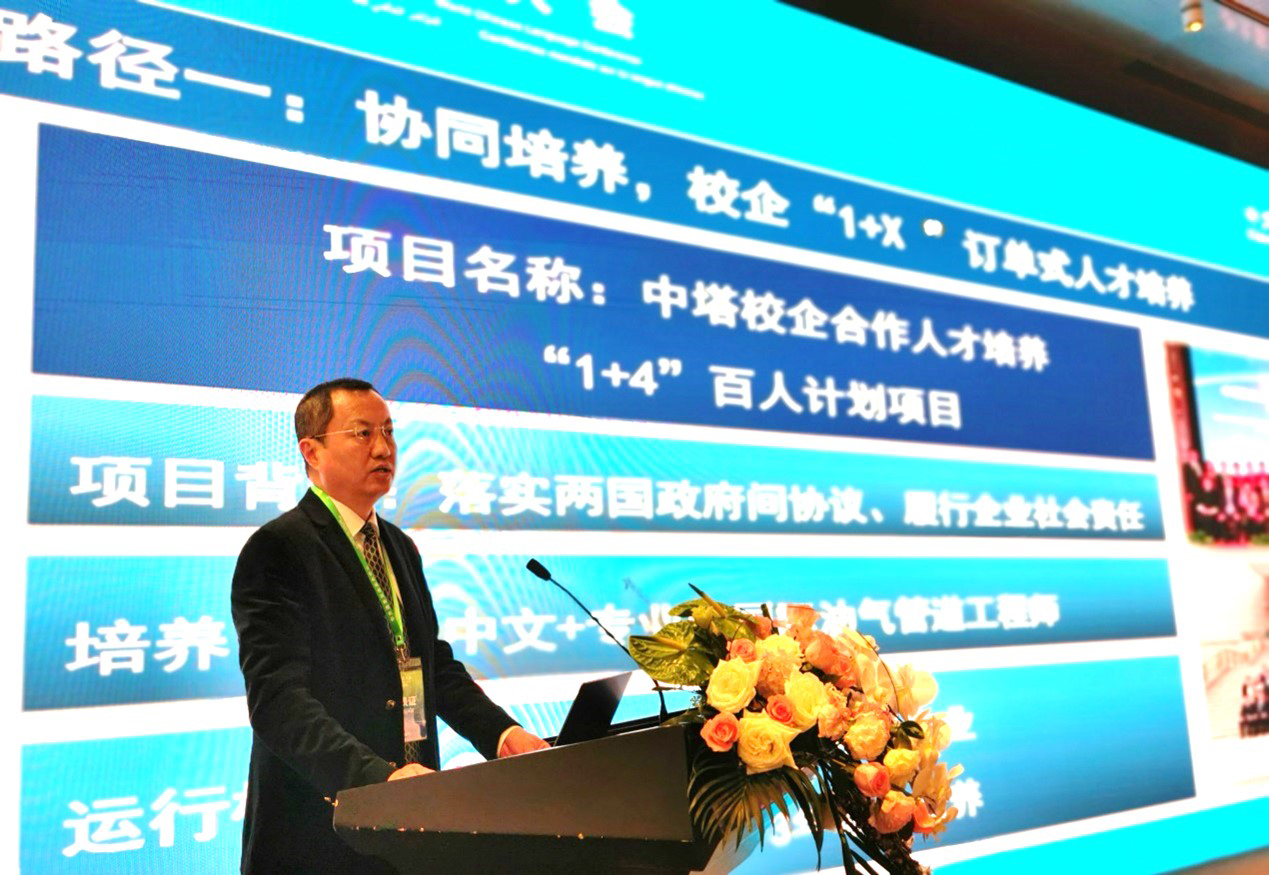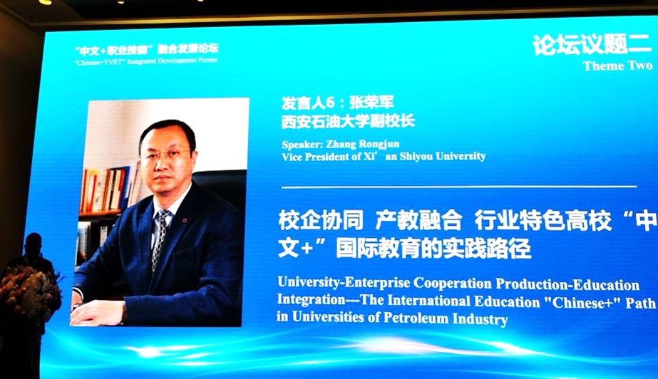 会上,张荣军围绕“中文+职业技能”融合发展,向与会者作《校企协同 产教融合 行业特色高校“中文+”国际教育的实践路径》报告。他指出,当前能源行业对国际化、复合型、专业化技术人才的需求日趋旺盛,在“一带一路”建设、国际能源合作等宏观政策驱动以及能源企业国际化、高校国际化战略需求驱动下,推进“中文+”国际教育成为能源行业特色高校国际中文教育高质量特色化发展的路径选择。