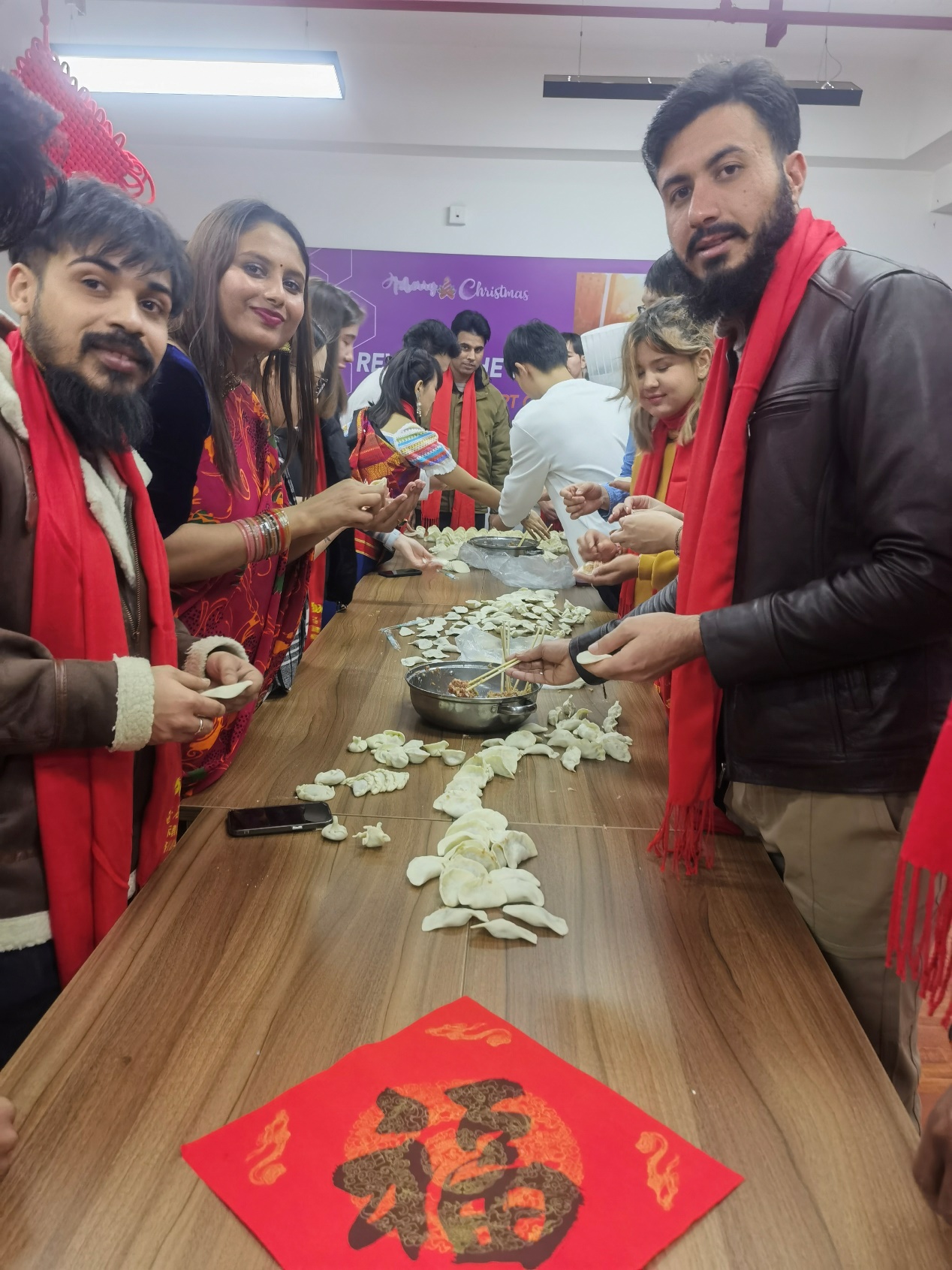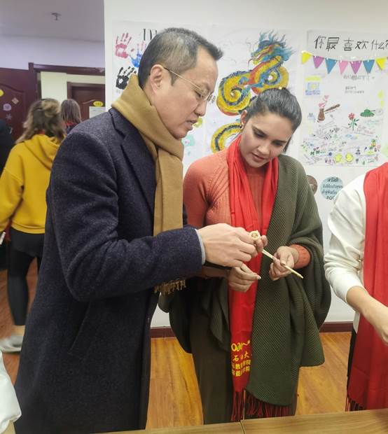 活动现场,威廉williamhill体育邀请了陕西省民俗学会、省书法家协会、西安皇城书画院等知名民俗专家、书法家莅临现场,与国际员工一道共度春节、书写对联、迎春送福。活动中,来自孟加拉国职工苏茹、吉尔吉斯坦白刚等同学表演了独具特色的民族舞蹈和中国歌曲等才艺节目。在“品味中国年”包饺子环节,张荣军与在场职工一起包饺子,亲自示范如何包饺子,国际员工公寓一派欢乐祥和节日氛围,师生共庆中国龙年到来。
