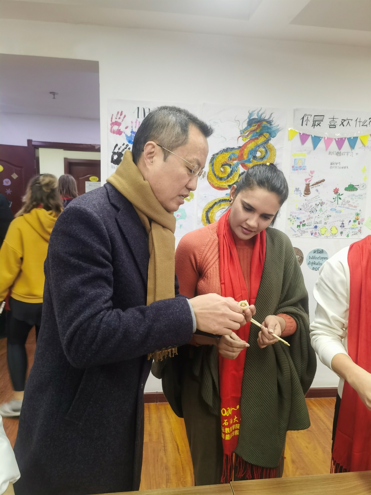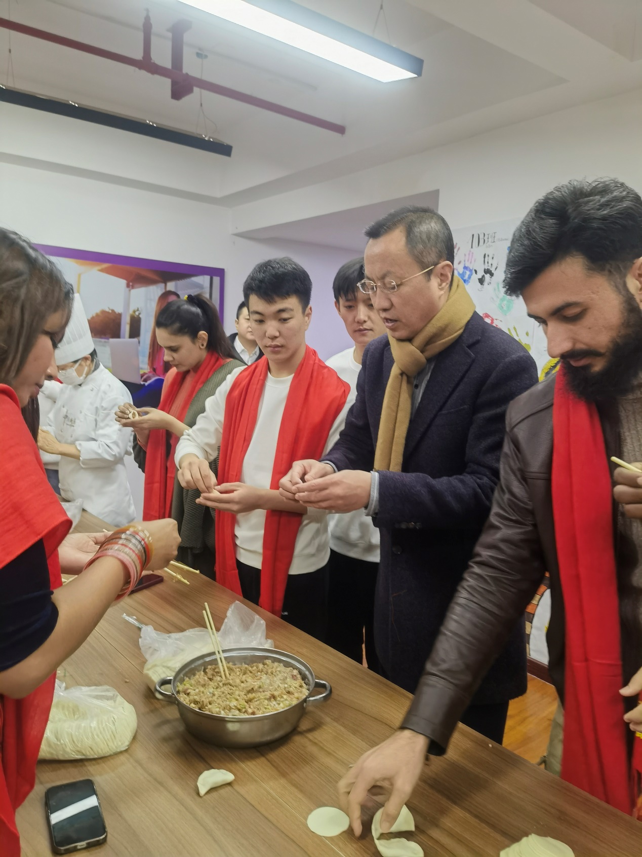 在“品味中国年”包饺子环节,张荣军与在场职工一起包饺子,亲自示范如何包饺子,国际员工公寓一派欢乐祥和节日氛围,师生共庆中国龙年到来。