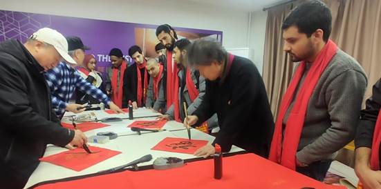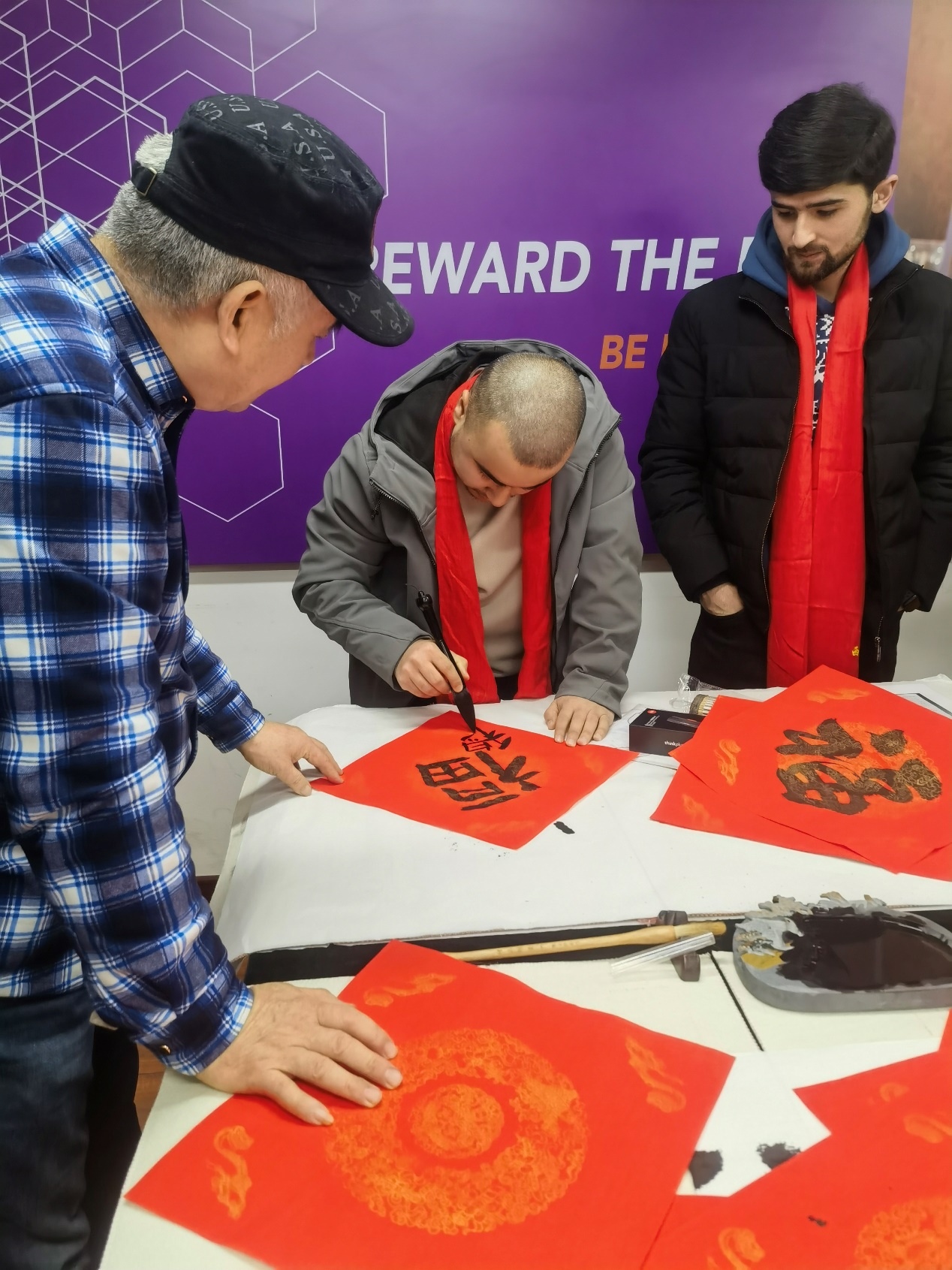 紧接着,国际员工们通过舞蹈、歌曲等才艺表演献上新春祝福。他们的精彩表演不仅赢得了现场观众的阵阵喝彩,也为中国新年增添了浓厚的喜庆氛围。随后,活动进入书法家写福字、写对联环节。陕西省民俗学会、省书法家协会、西安皇城书画院等知名民俗专家、书法家纷纷挥毫泼墨,为国际员工书写福字和春联。书法家们的精湛技艺和中华悠久深厚的文化底蕴让在场的职工们赞叹不已,他们纷纷表示这是他们第一次如此近距离地感受中国书法的魅力。