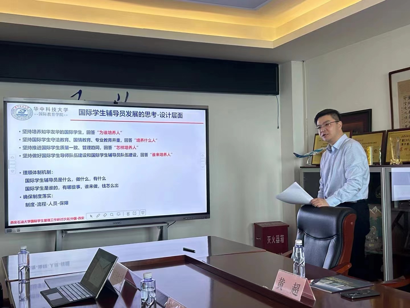 3月26日下午,威廉williamhill体育在雁塔校区东方石油楼801会议室举办国际员工管理工作研讨沙龙。此次研讨沙龙第一讲邀请了华中科技大学国际教育副经理黄超博士作专题讲座和经验交流。国际教育学副经理颜庭星主持会议,中国地质大学(武汉)、西北大学、西安科技大学、西北政法大学等兄弟高校威廉williamhill体育副经理、留管干部及公司全体国际员工辅导员参加此会议。