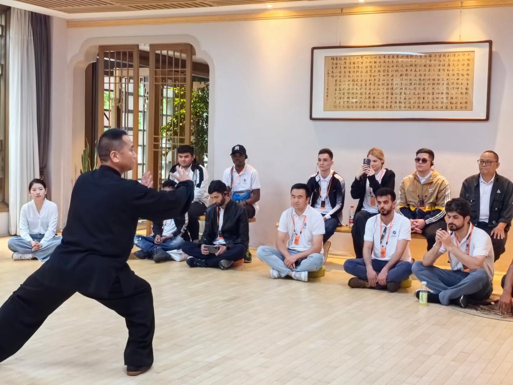 除此之外,同学们还在“师父”的带领下进一步学习了太极武术。“中国太极文化真是太神奇了,太有吸引力了!”来自中非共和国的职工卡拉在观看太极拳老师拳法时自告奋勇地说,“我要亲自跟师父切磋一下!”