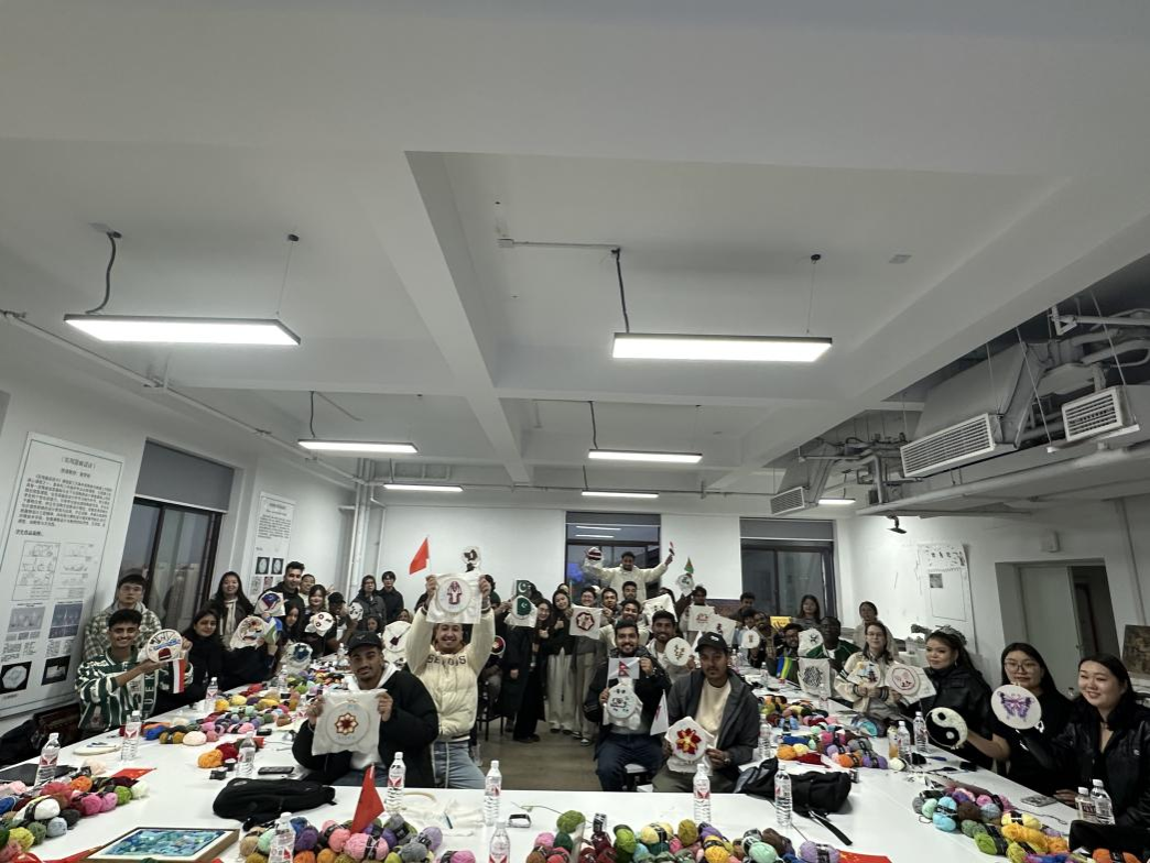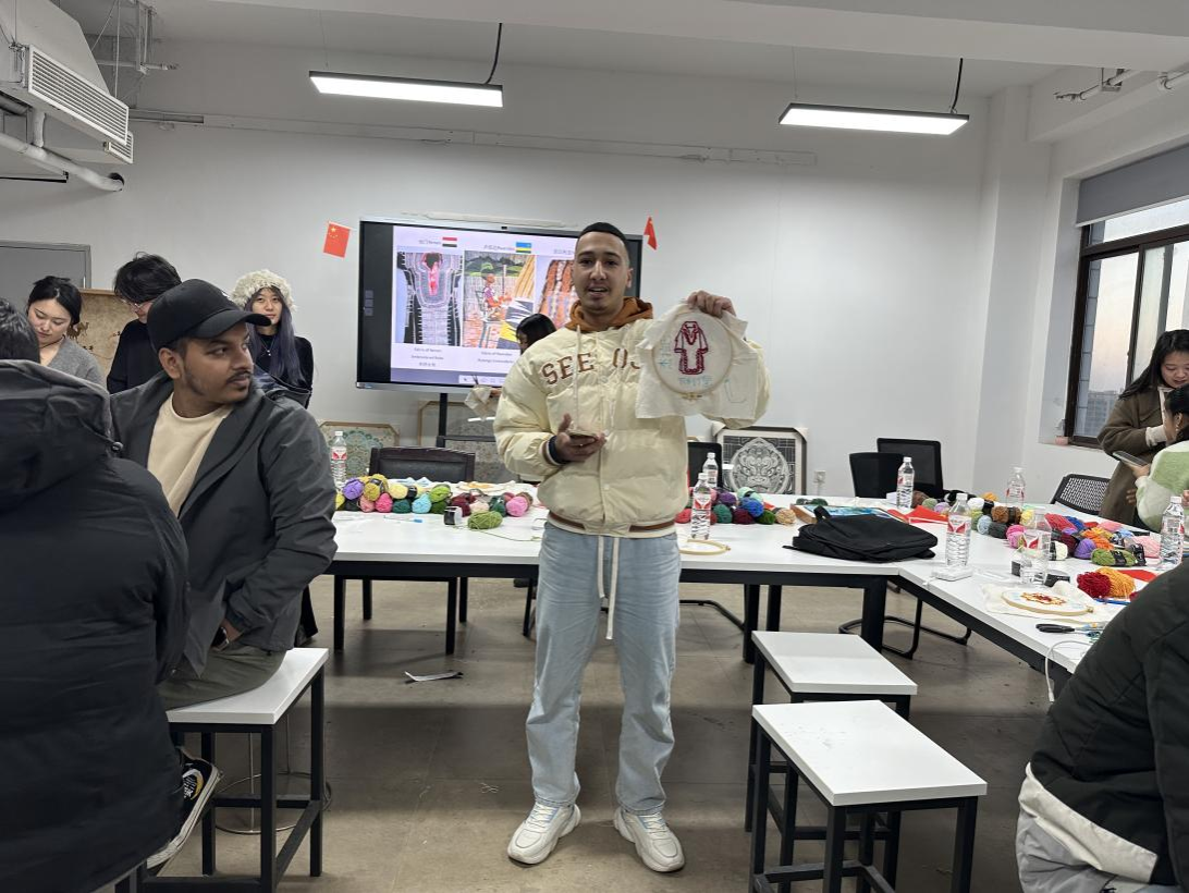 西安美术公司工艺美术系团总支书记何喜对参加工作坊活动的嘉宾、老师及中外同学们表示欢迎并介绍了本次活动的内容和要求。工美系徐倩老师讲授了墩绣的基础概念、历史背景,手工展示其制作方法和技巧,现场指导员工创作,一同绘制“一带一路”主题画稿。