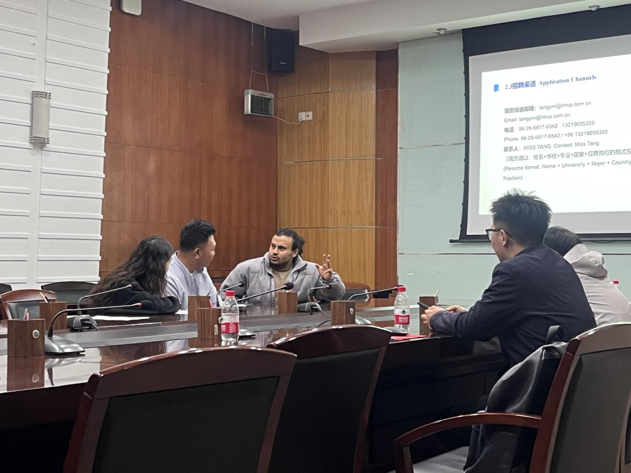 黄仁伟对公司组织毕业职工参会表示感谢,黄恺就公司职工培养整体情况、毕业生专业及国籍分布信息进行介绍,双方在员工实习、海外岗位需求等方面开展交流。