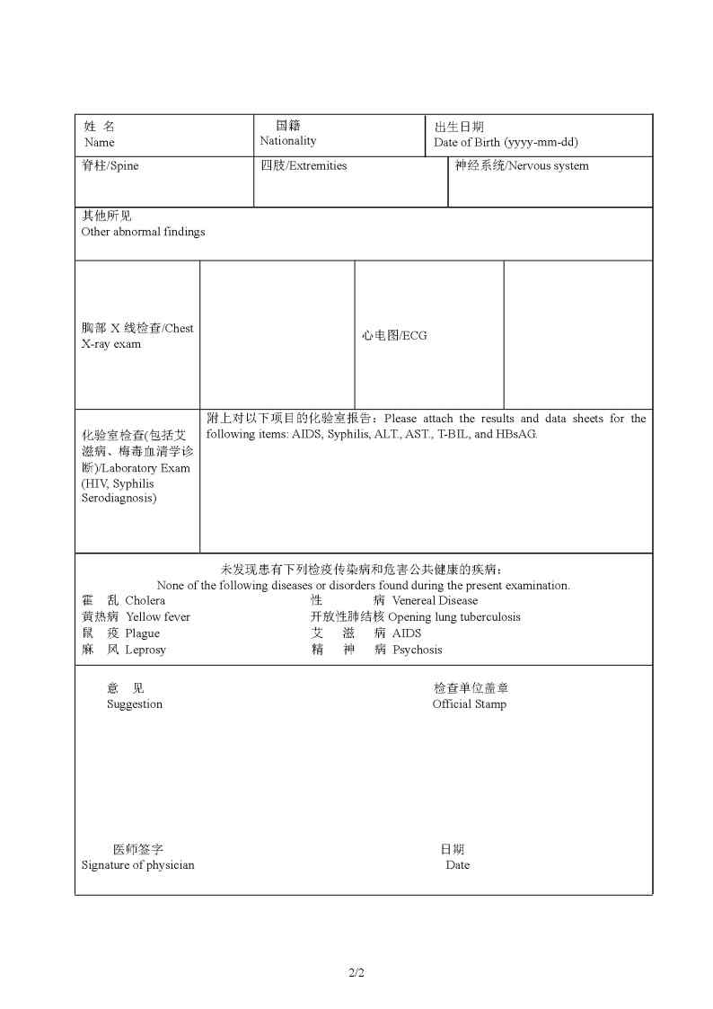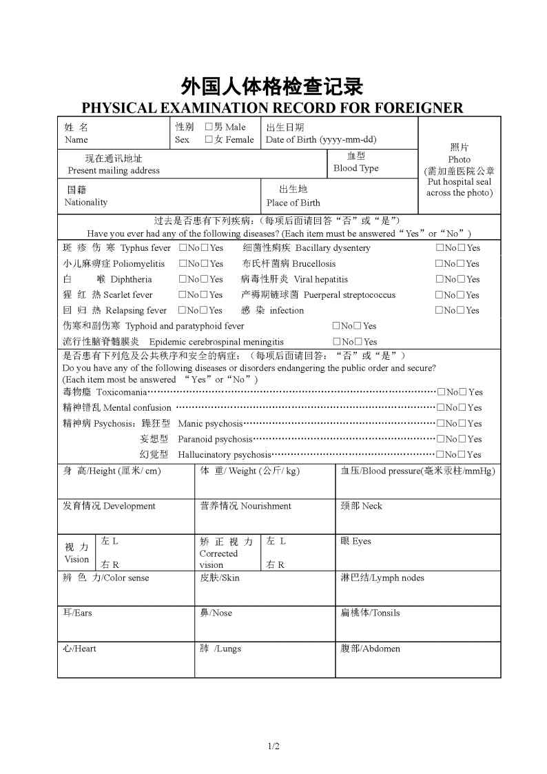外国人体格检查记录登记表下载 Download Physical Examinatiopn Record for Foreigner